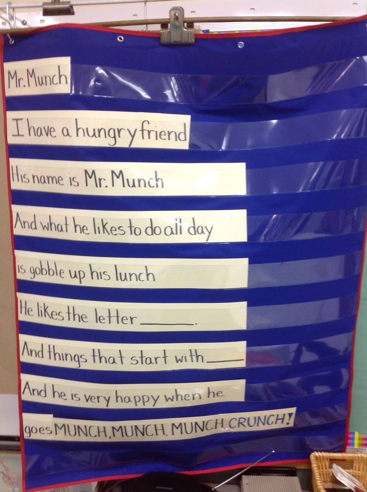 Mr. Munch woke up from his nap and made an appearance again today! He ate letters D through H! Friends are getting really good at naming things beginning with specific letters that Mr. Munch could eat. Thoughtful contributions included - Eggs, Flowers, elbows, grapes, and hair! Man, that Mr. Munch must have a stomach ache!
